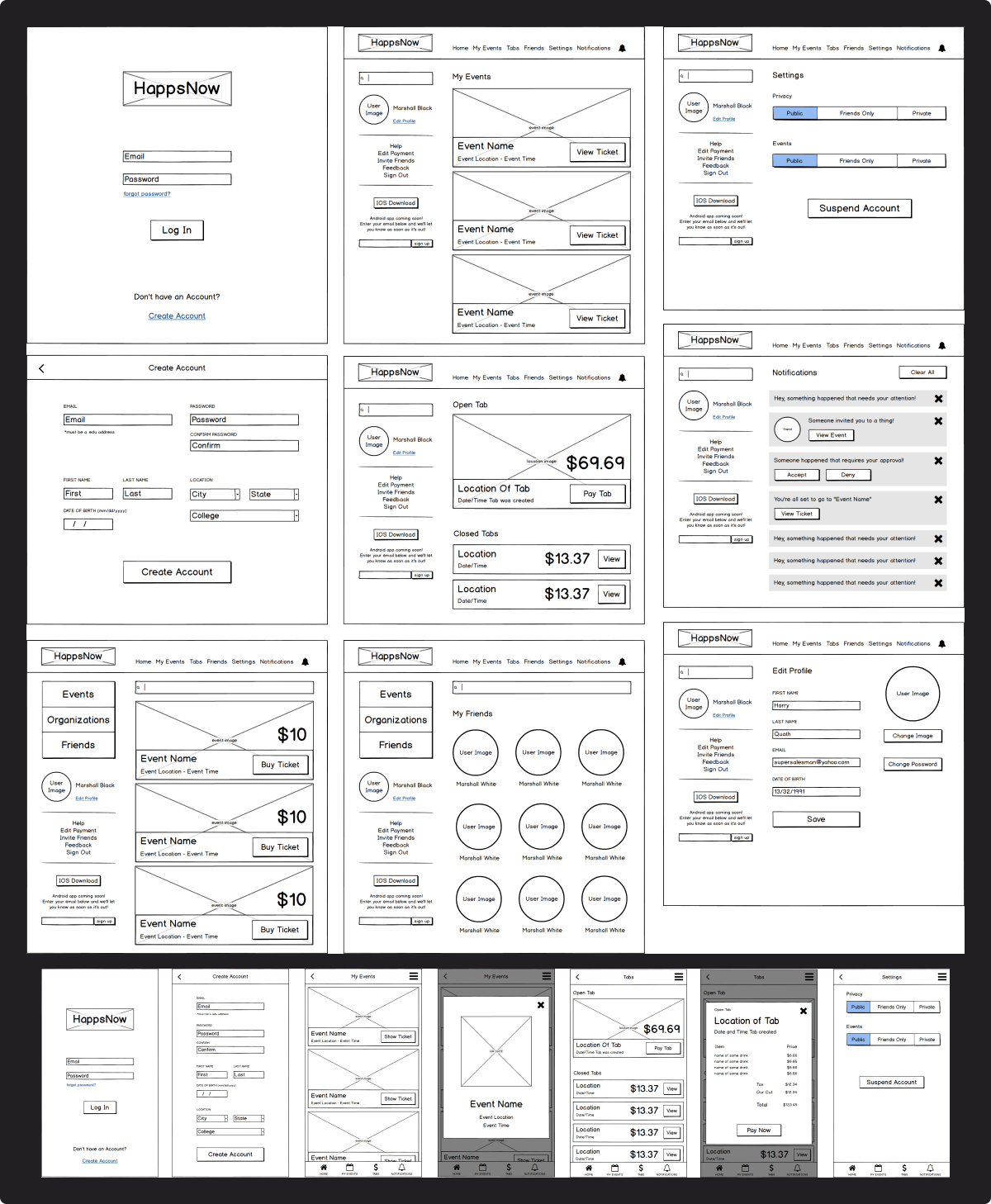 HappsNow was primarily the mobile app with a companion web portal, so the mobile screens came first. I did an initial version of every screen and went through several rounds of design review with the team.