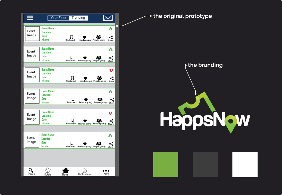 HappsNow was an event ticketing startup trying to break into a saturated market with an approach that simplified the process and made it more engaging for younger users. I was brought it early in the process when all they had was a simple prototype.