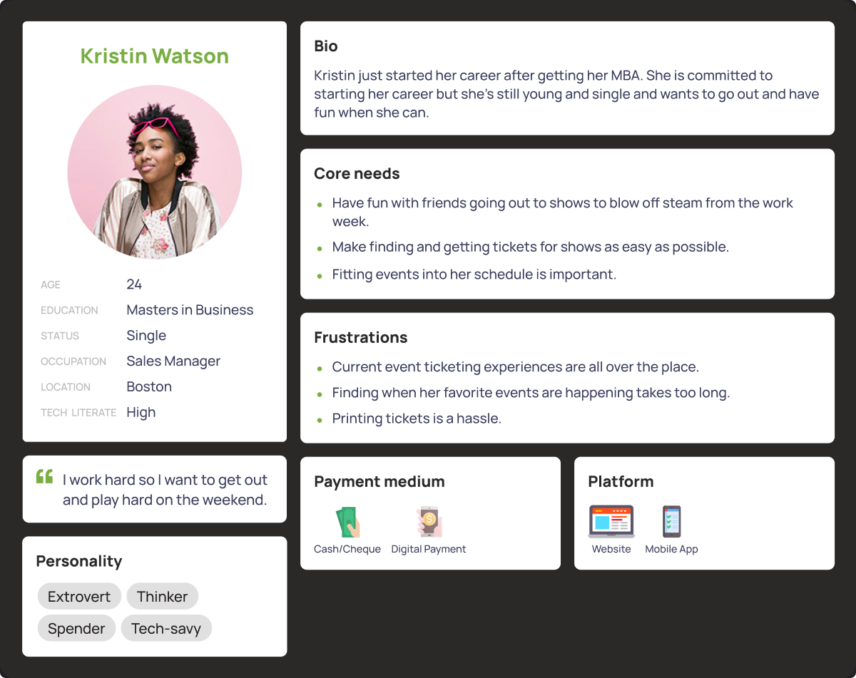 We completed the research phase by conducting user interviews and developing a user persona. We were targeting a younger demographic: college aged and young adults.