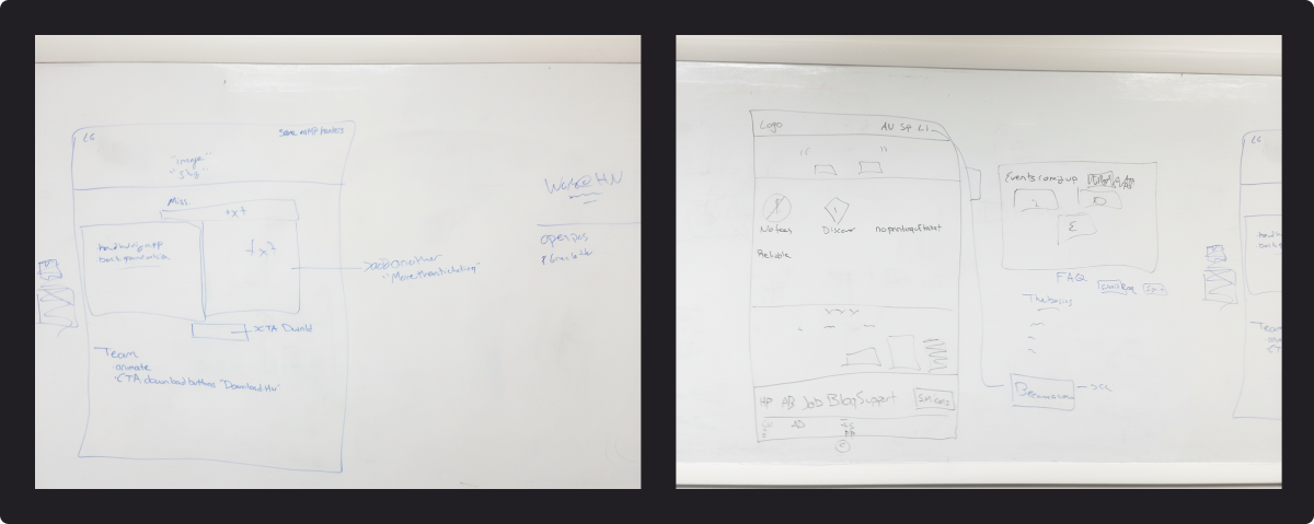 With the research phase done, we got together and worked out all the requirements on a whiteboard. We started with a sitemap and then did sketches of individual pages.